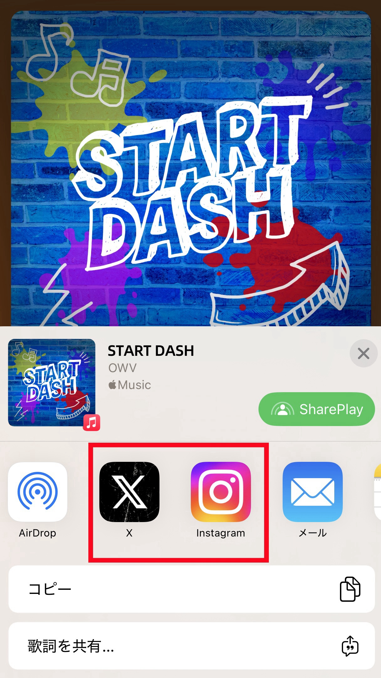 2. 楽曲タイトルの横にある「・・・」ボタンをタップし、楽曲をシェアする(共有する)でX(旧Twitter)またはInstagramを選択。